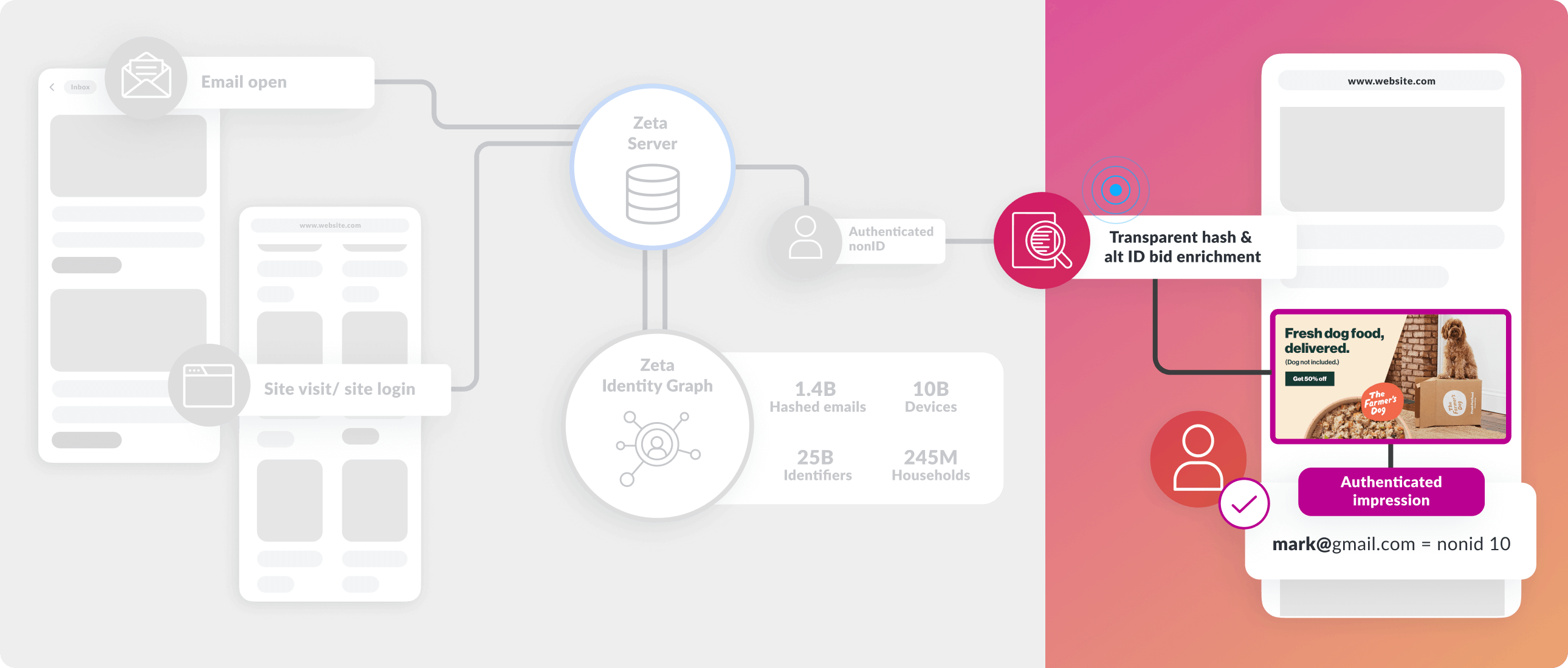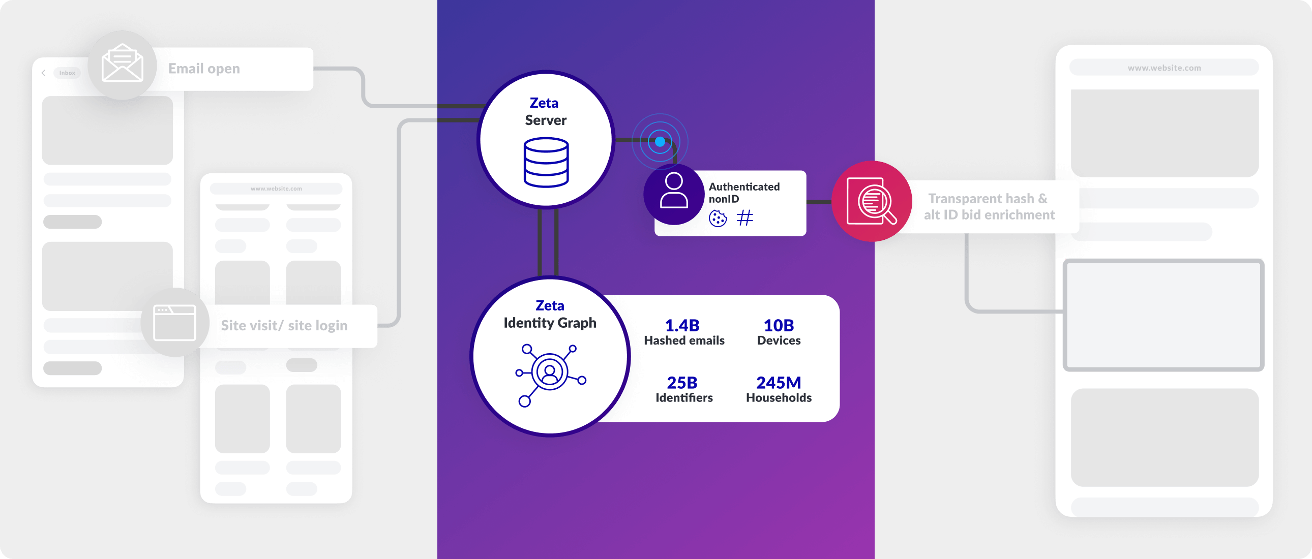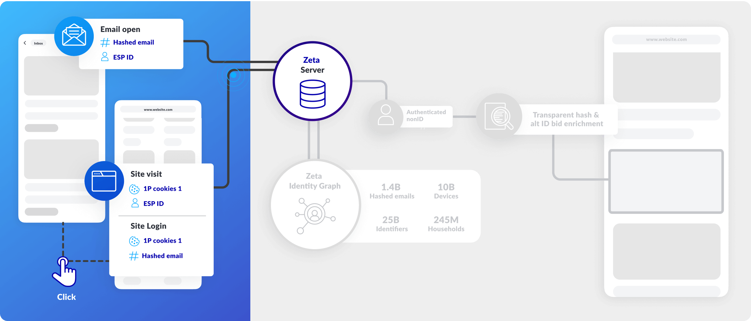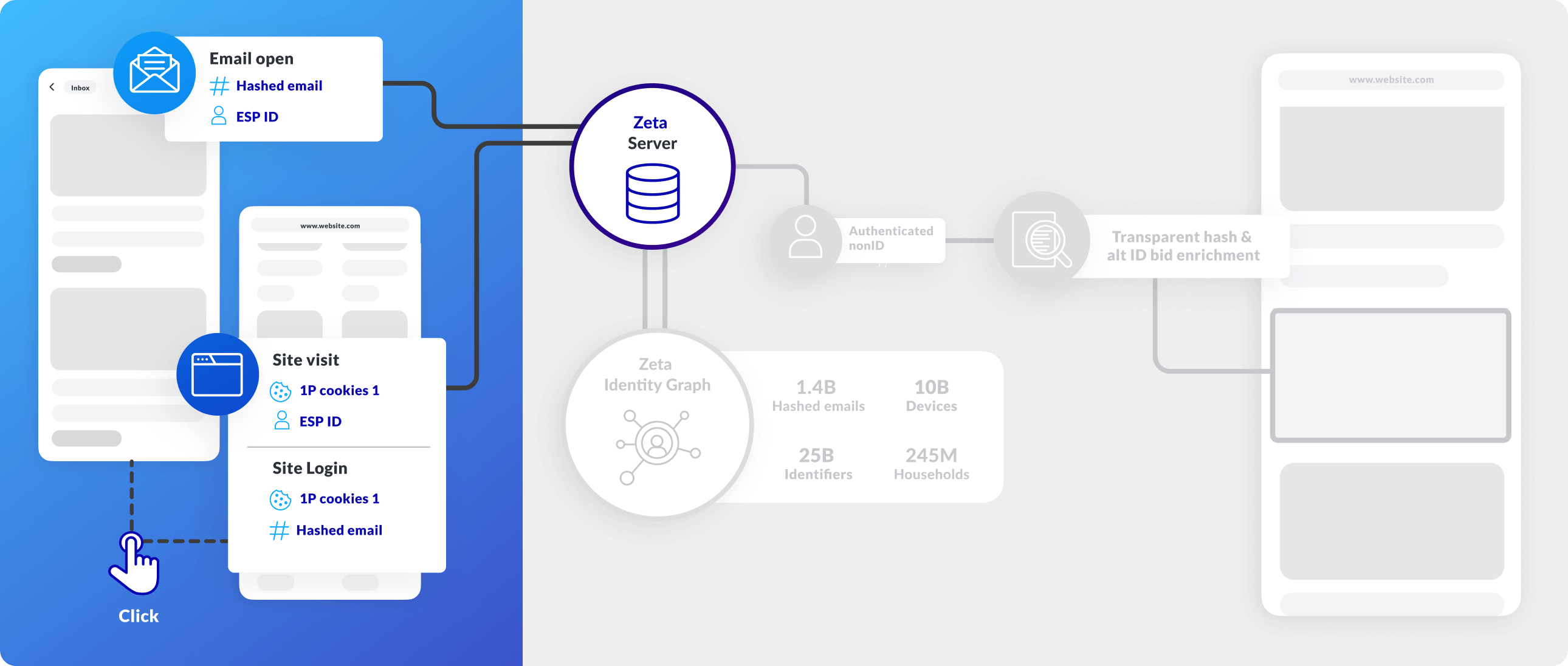1st Party Cookie, Hashed Email & ESP IDs sent to Zeta servers for authentication