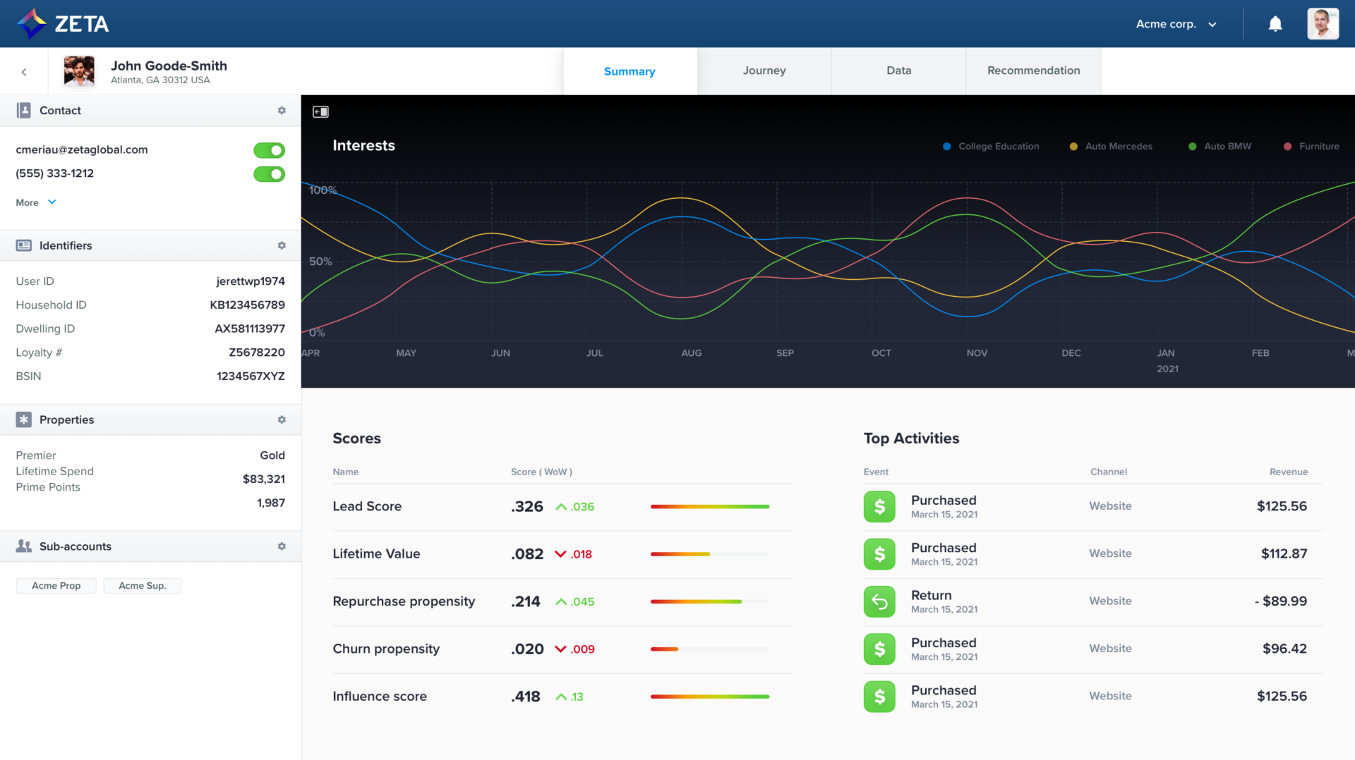 Once Zeta’s proprietary intelligence creates a more comprehensive profile, these insights can be translated into more relevant messaging and individualized experiences across channels. One-time buyers become repeat customers when you leverage Zeta’s AI to cross-sell related products, predict the offer that drives conversion, and recommend channels that support friction-free servicing. All of which serves to increase lifetime value.