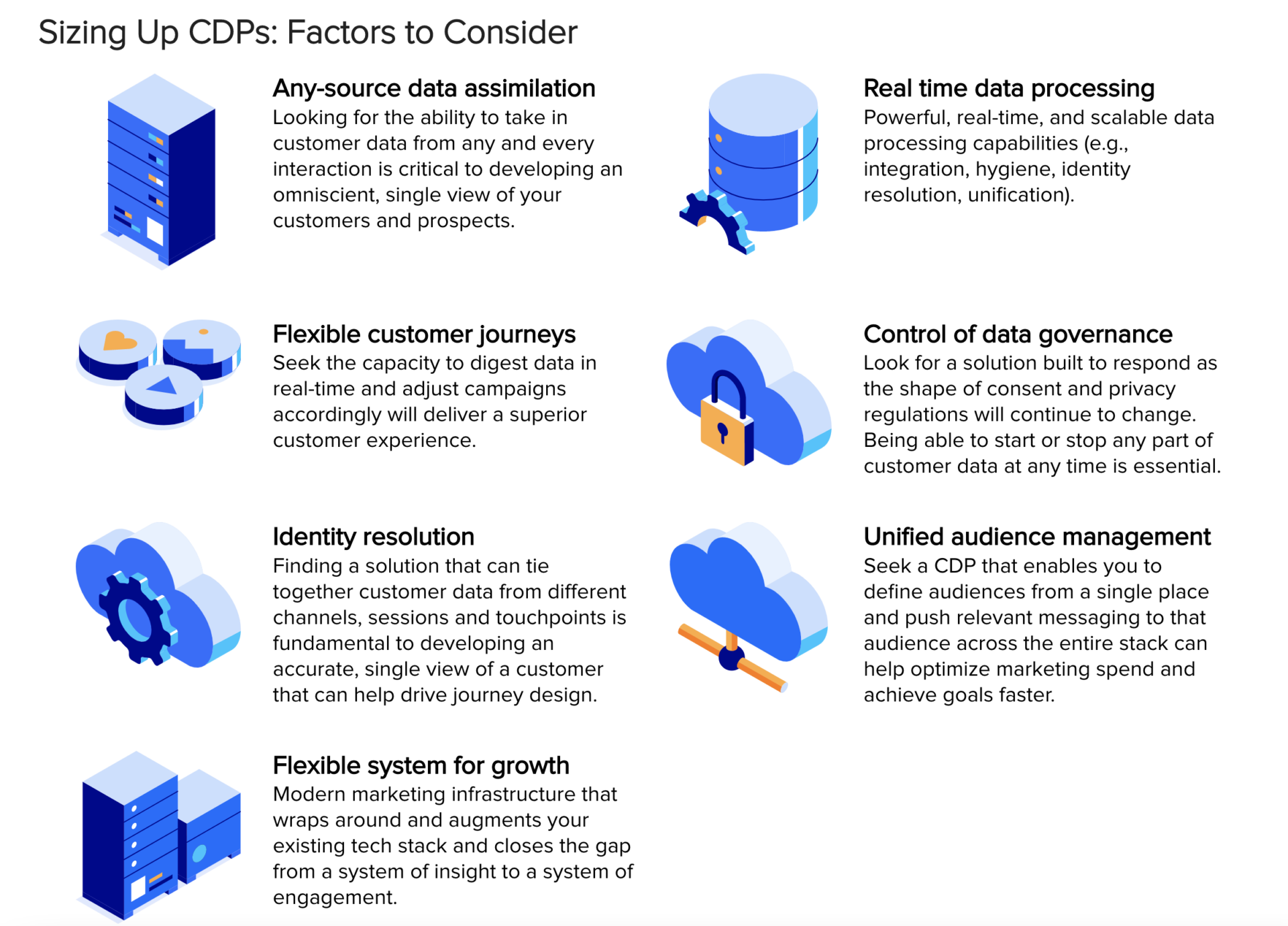 CDPs help companies future-proof their relationships with customers. They make sure you have the insights you need to reliably deliver memorable experiences that get more customized and delightful over time. On the back end, the right CDP unearths increasingly incisive and crystal-clear insights, robust data quality, spot-on governance, and strong integrations with the rest of your tech stack. It’s all possible today in the context of a relationship with the right CDP provider.