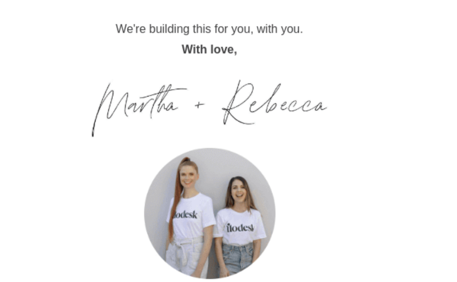 Flodesk uses a signature from their founders and a photograph, making the message feel more personal and less like a marketing email.