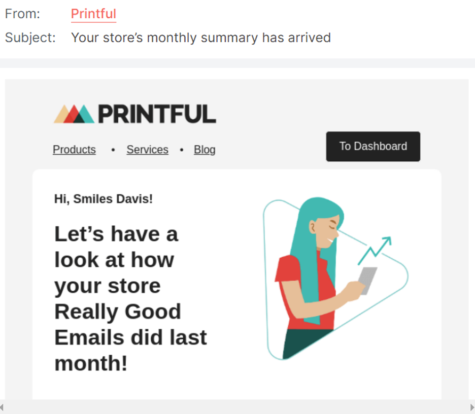 Don’t be afraid to take it beyond the name tag. Messages can leverage other personal information such as industry, past purchases, or location. This example from Printful mentions the user’s store in the subject line and their name in the body of the email: